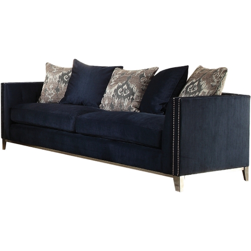 Acme Furniture Phaedra Sofa with in Blue Fabric with Nailhead on Stainless Legs