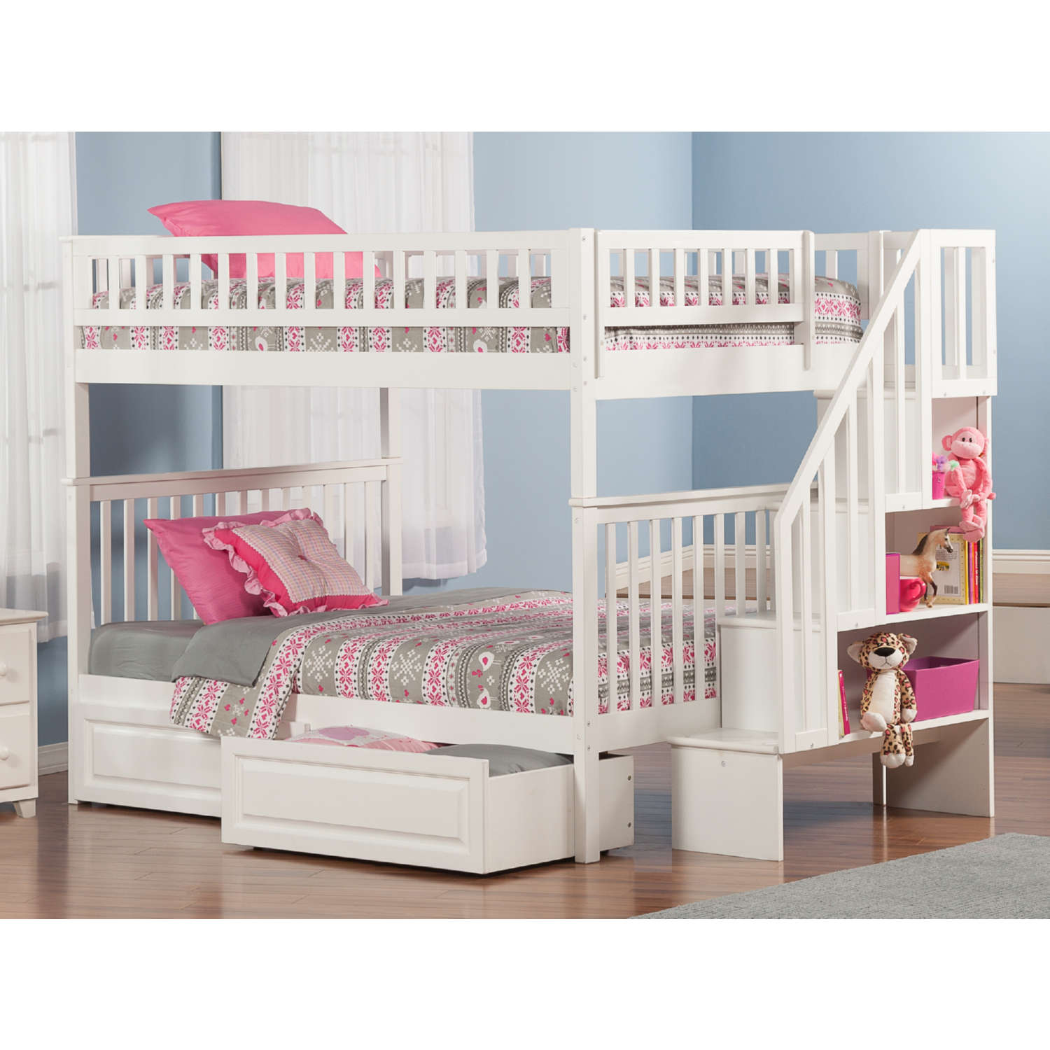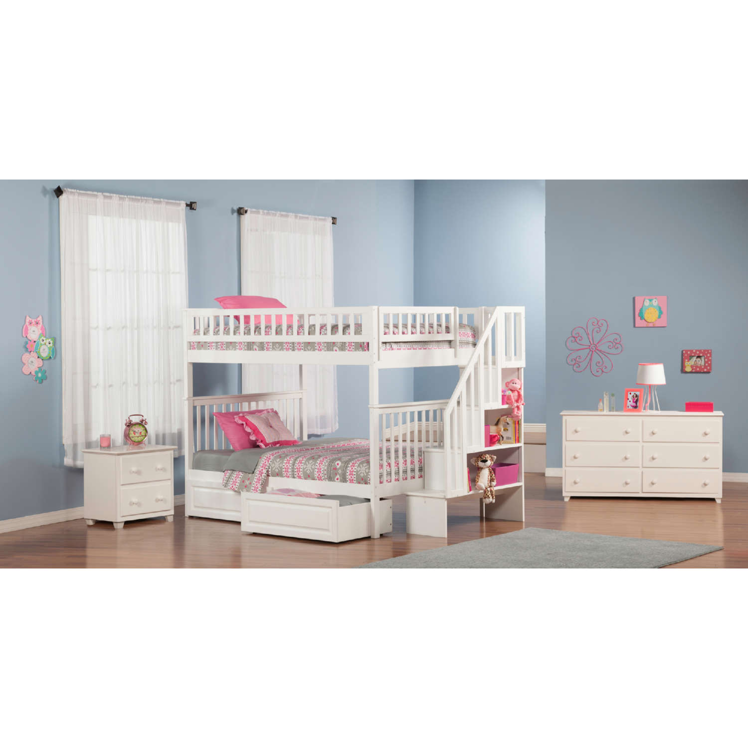 AFI Furnishings Woodland Staircase Full over Full Bunk Bed with 2 Raised Panel Bed Drawers in White