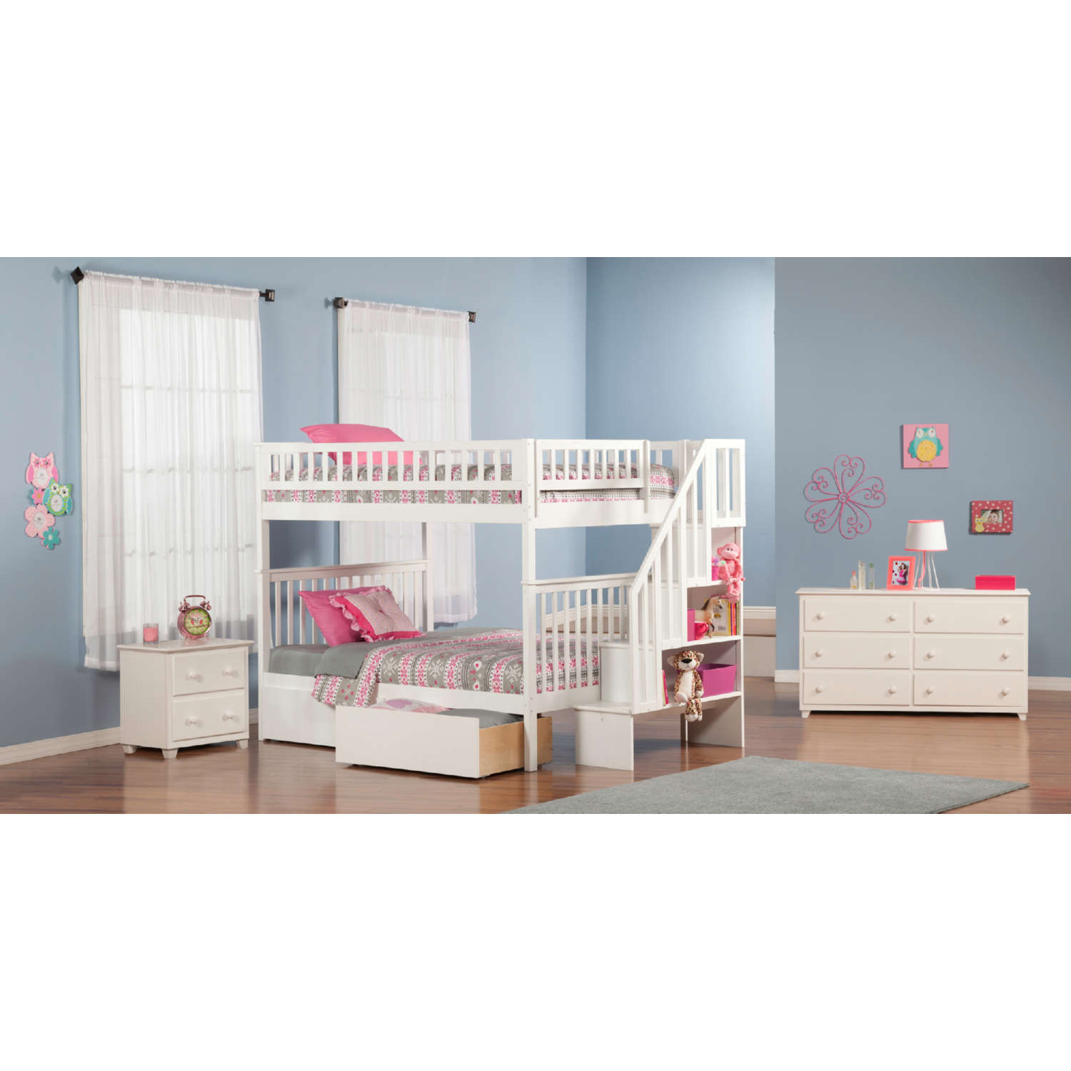 AFI Furnishings Woodland Staircase Full over Full Bunk Bed with 2 Urban Lifestyle Bed Drawers in White