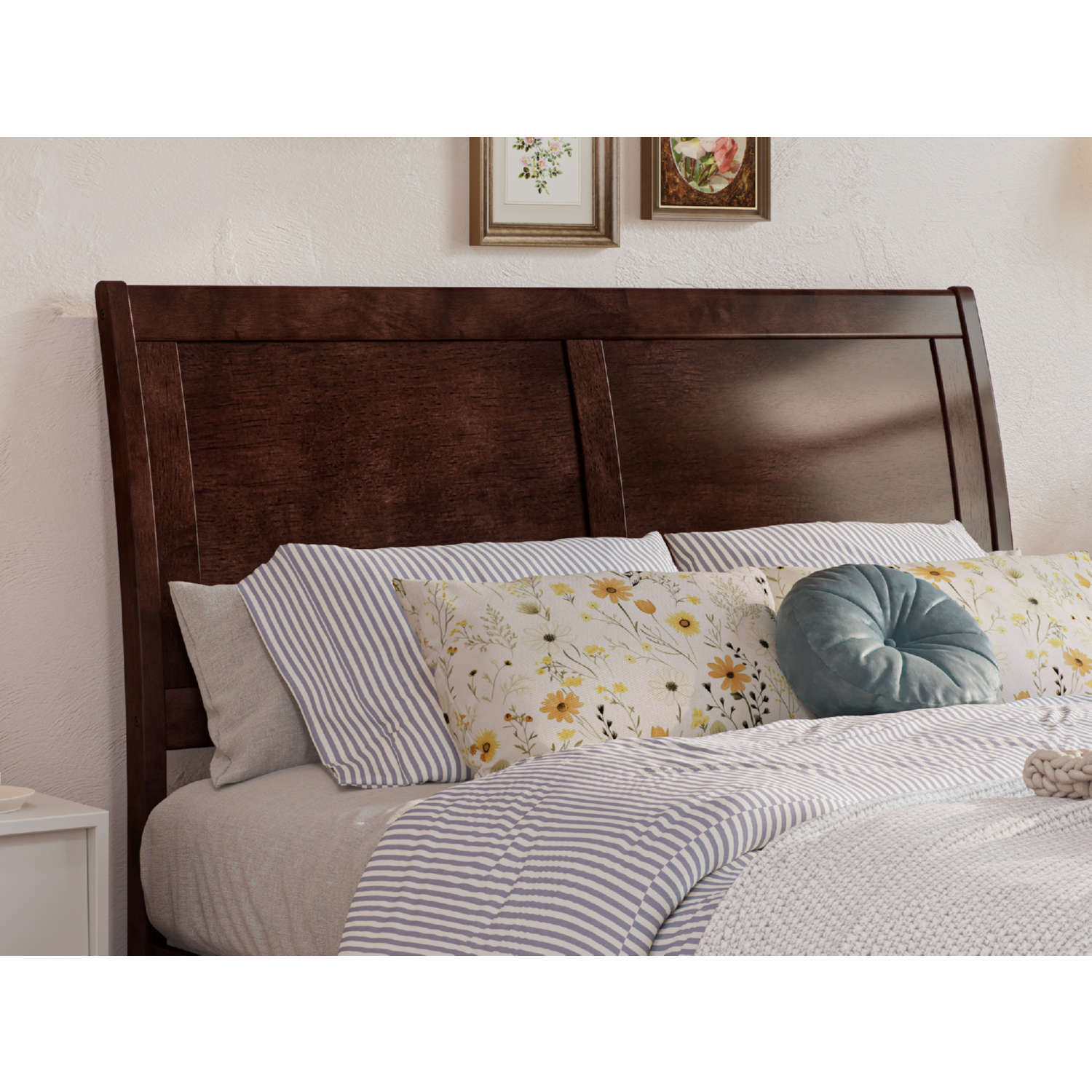 • Sleek, curved panel sleigh headboard provides a contemporary style