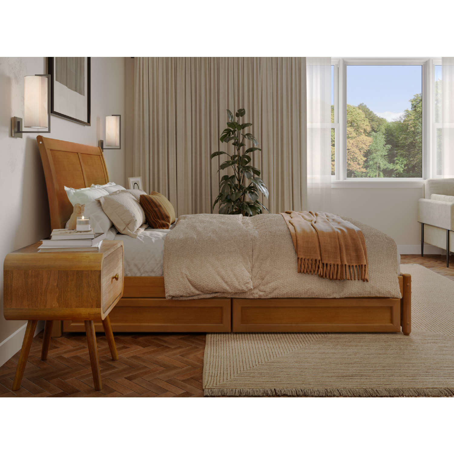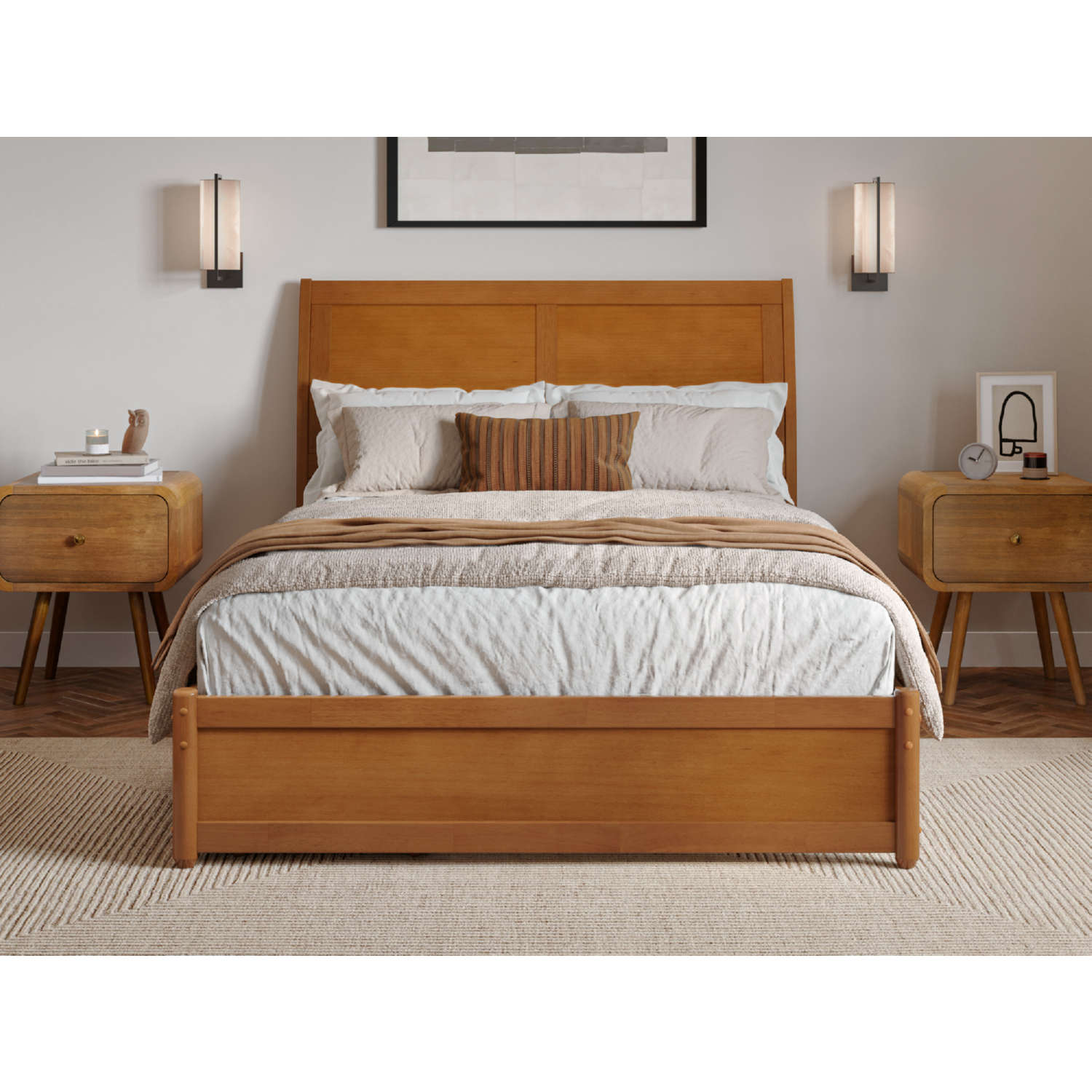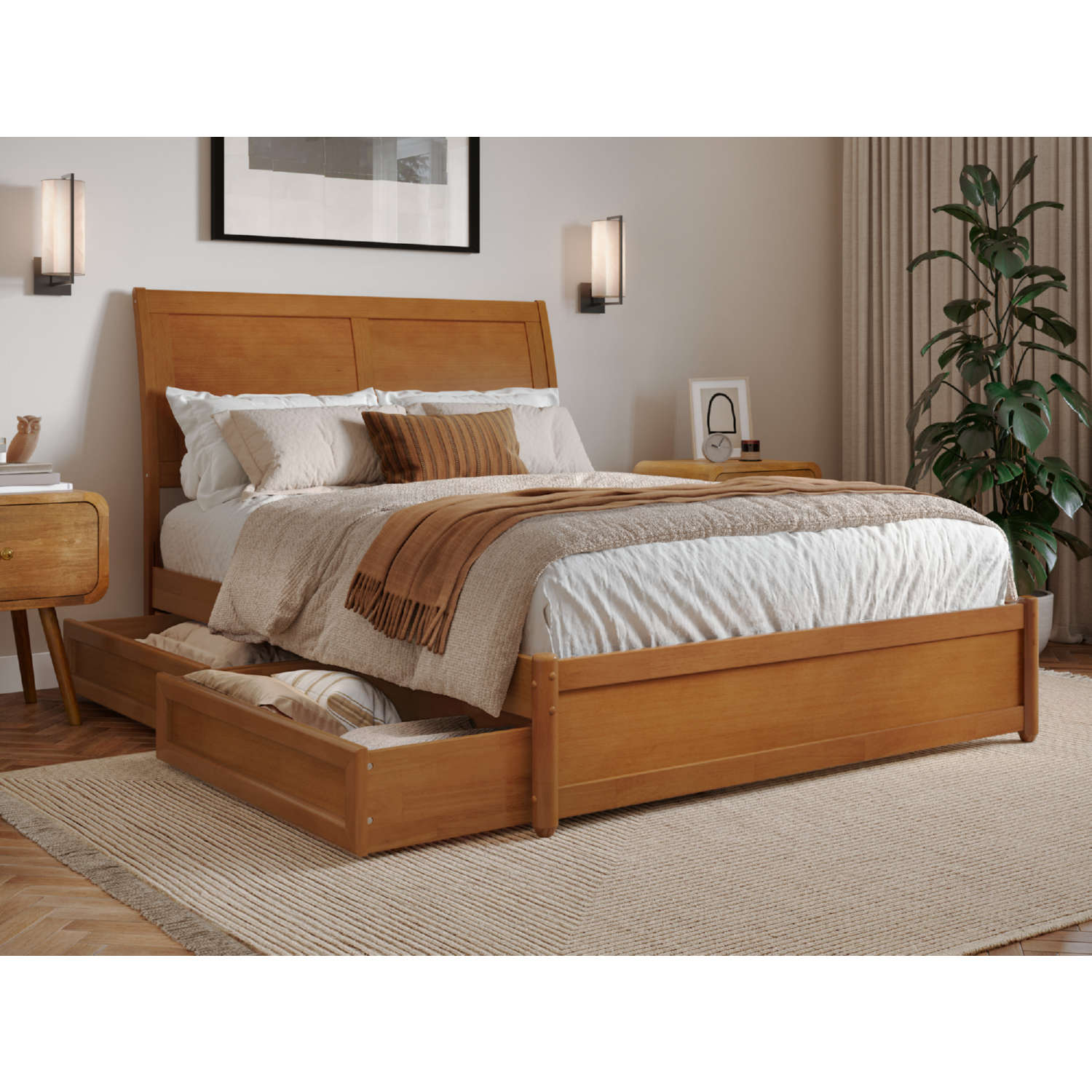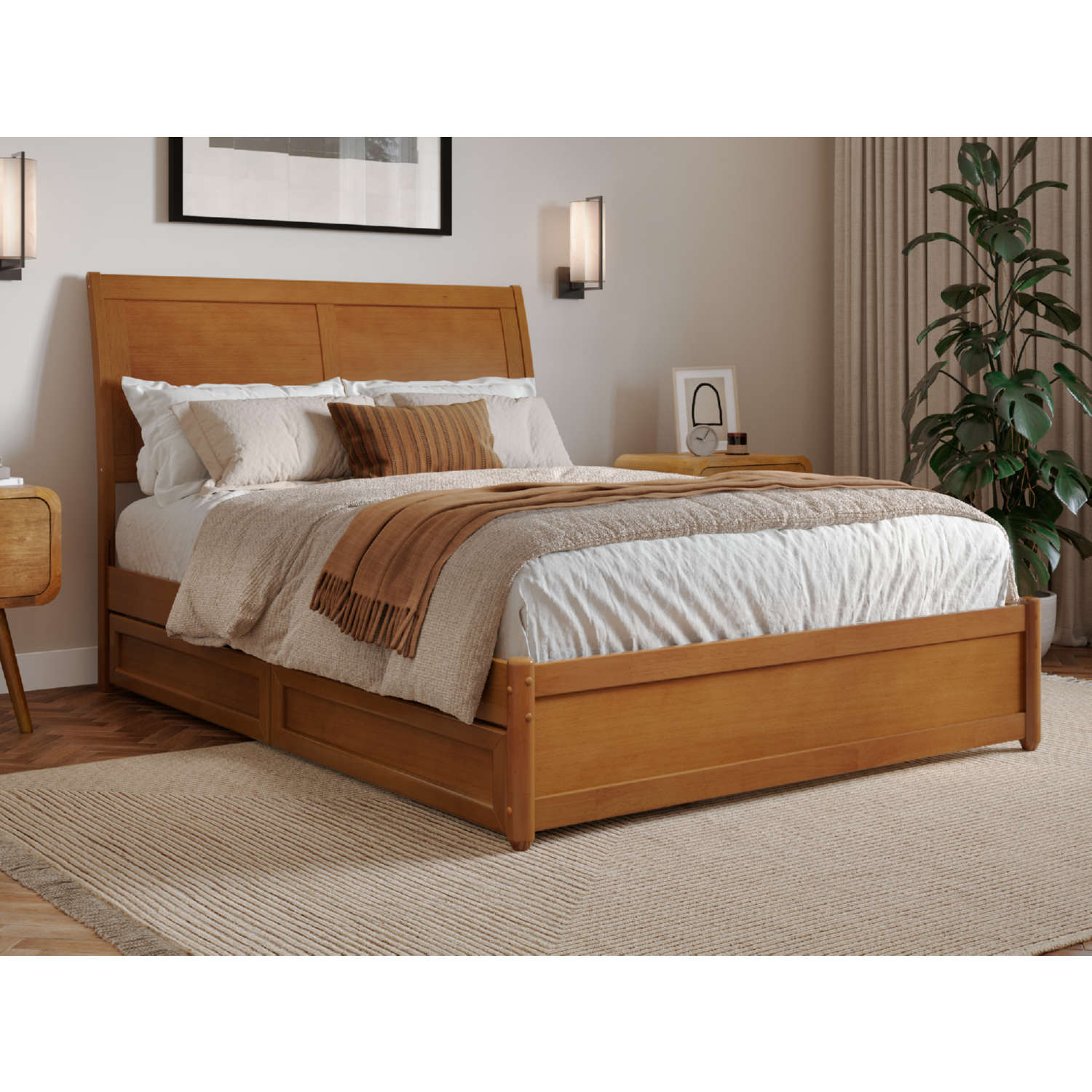 AFI Furnishings Andorra Full Platform Bed with Panel Footboard, Drawers & Charging in Light Toffee