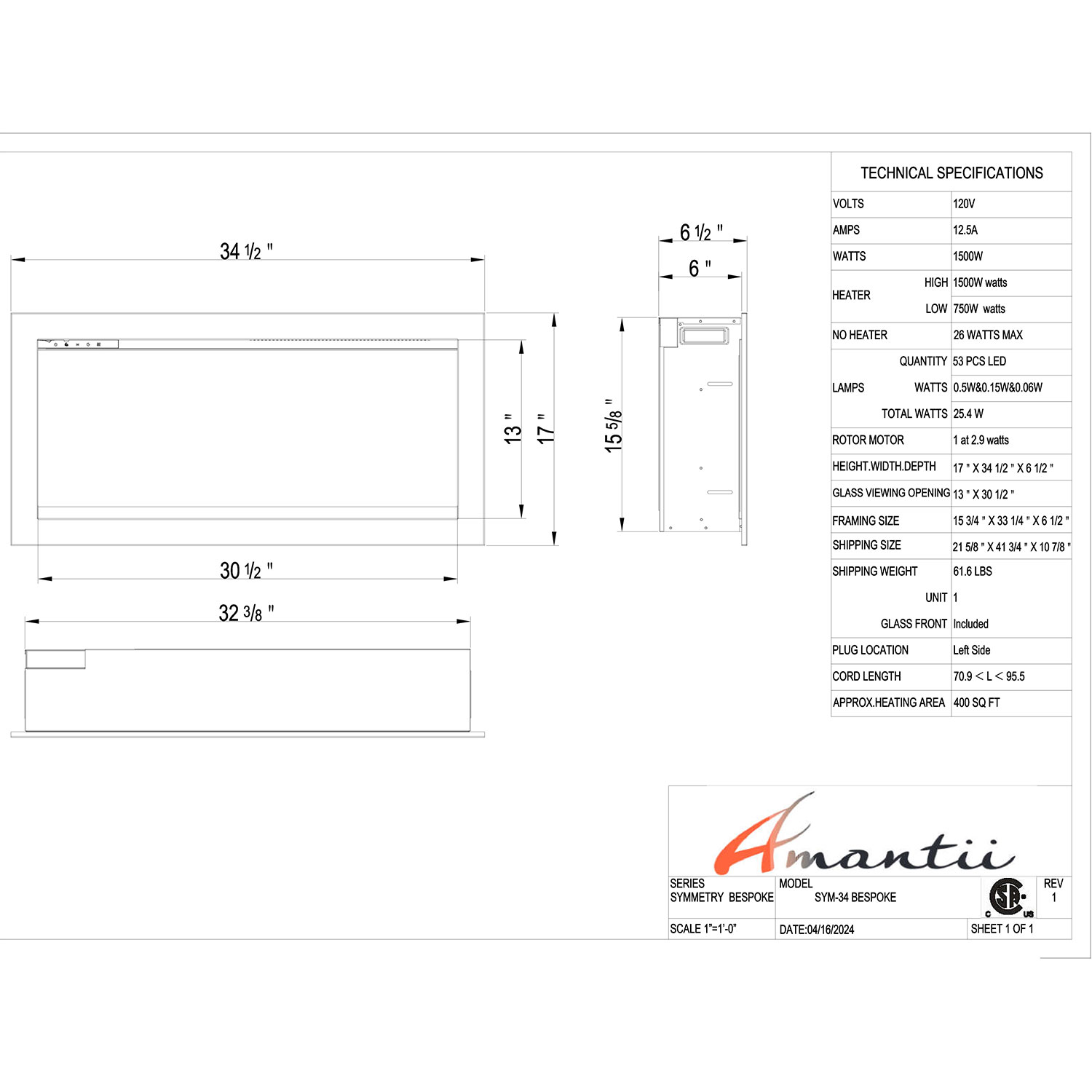 Dimensions: 34.50"W x 6.50"D x 17"H, Surround Size: 34.50"W" x 17", Insert: 32.375"W x 6"D x 15.675"H, Glass Viewing Opening: 30.50"W x 13"H
