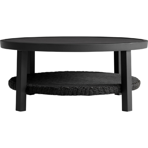 Armen Living Grand Outdoor Round Coffee Table in Black Aluminum & Wicker
