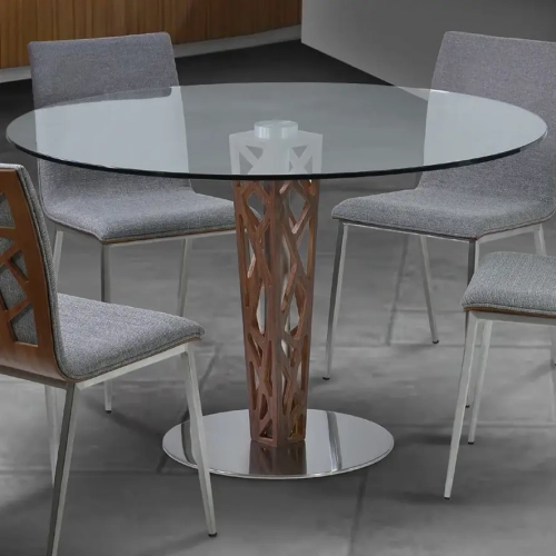 Armen Living Crystal 48" Round Dining Table in Walnut Veneer, Brushed Stainless Steel & Tempered Glass Top