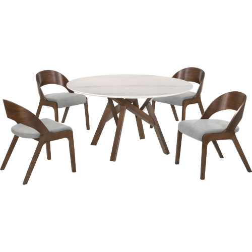 Armen Living Venus & Polly 5 PC Dining Set in White Marble Look, Grey Fabric & Walnut