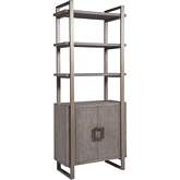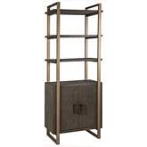 Mahogany solids and veneers with hand wire brushed graining balance the metal frame and hardware in a warm metallic, hint of copper, finish. The upper section features three stationary wooden shelves and the two doors open to two adjustable shelves. Available in multiple finishes.