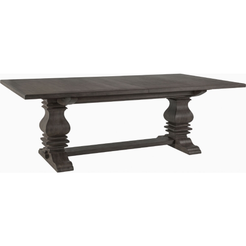 Casual designs crafted from Mahogany in the Antico finish, a warm medium brown wood tone with a hint of gray on a hand wire brushed surface. The 88" table extends to 124" with two 18" leaves to seat 12 comfortably. The top features mitered corners and is scored for a plank effect balanced in design by the carved pedestal legs with a wooden stretcher.