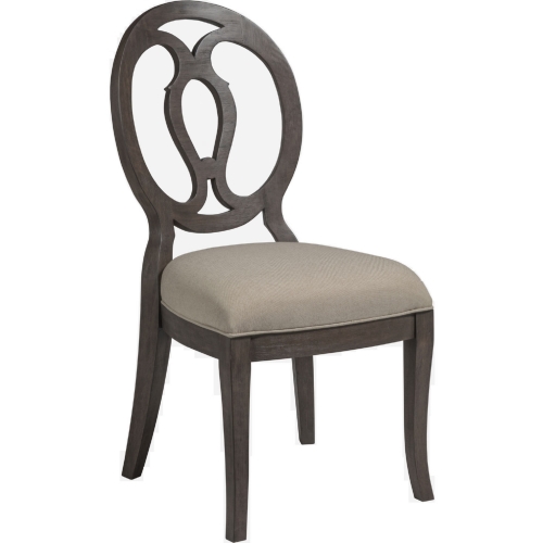 Casual design crafted from Mahogany in the Antico finish, a warm medium brown wood tone with a hint of gray on a hand wire brushed surface. The wooden oval back chair has an upholstered seat in a linen and cotton blend with a soft feel in a natural greige color.