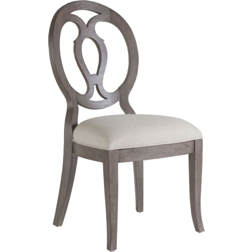 Casual design crafted from Mahogany in the Grigio finish, a warm gray tone with hand wire brushing. The wooden oval back chair has an upholstered seat in a linen and cotton blend with a soft feel in a natural greige color.
