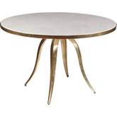 Hand-forged iron base in gold foil finish with inset veneered white crystal fossilized stone top. The top will vary in color from piece to piece.