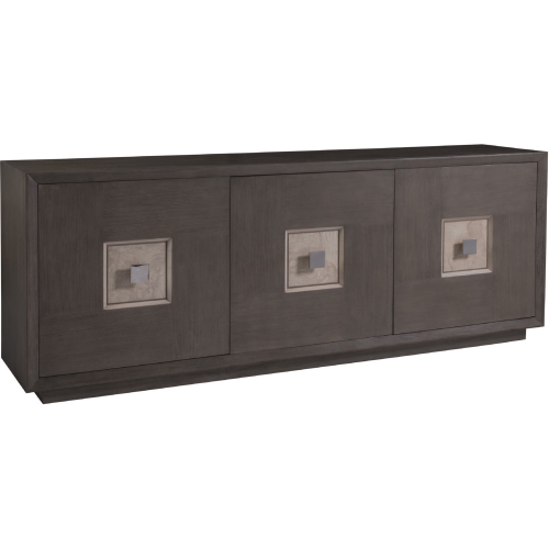 Bleached olive ash burl, white oak veneers and select hardwoods. The media credenza includes three doors, six adjustable shelves, ventilated back, and wire management.