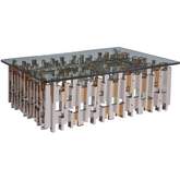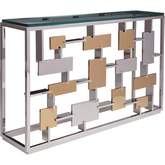 Contemporary asymmetrical designs crafted from stainless steel with certain elements electroformed with brass in a vintage color paired with a 60" glass top. Stainless steel and brass will show slight imperfections and polishing marks.