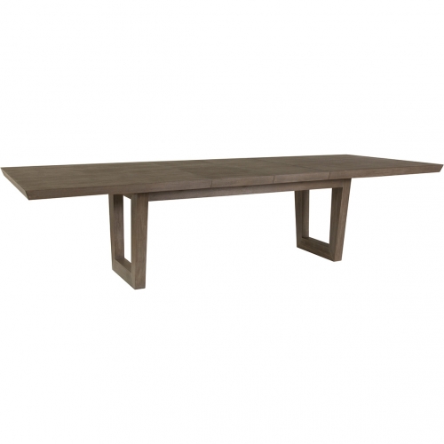Tapered sled bases and a thick chamfered top edge give the Brio Rectangular Table its stately architectural form as a centerpiece for a range of Cohesion chair designs. Mahogany solids and veneers in a straight grain pattern on the top with hand wire brush graining in the Grigio finish, a warm gray tone. The 88" rectangular table extends to 124" with the two 18" leaves, comfortably seating twelve, supported by open rectangular block legs