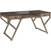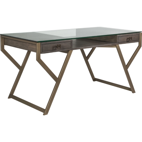 Contemporary writing desk crafted from Mahogany solids and veneers with a warm metallic finished frame and hardware and a tempered glass top. The Antico finish, a warm medium brown wood tone with a hint of gray on a hand wire brushed surface.