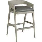 Contemporary designs crafted from mahogany solids in a white wire brushed sandblasted finish with a complementary white finished cane on the outside back. The upholstered seat and interior back are available as shown in Grayson fabric 430371 - a cafe mocha gray colored faux leather with embossed grain pattern. The barstool includes a metal kickplate in a gunmetal gray color.