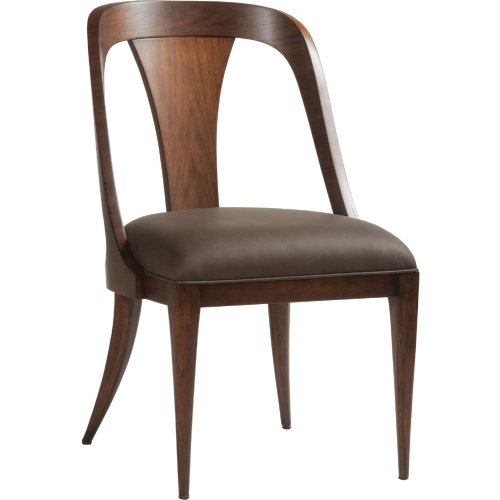 Classic designs crafted from walnut veneers and select hardwoods with a tapered wooden back splat. The upholstered polyurethane seat is standard in fabric 427171 Austin, a rich chocolate brown faux leather with a soft feel and smooth texture.