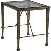 Traditional design with heavily hammered and textured iron base in a bronze foil finish. The lay on glass top is .75 inches with a flat polished edge.
