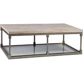 Transitional design in antiqued silver leaf finished iron base with a sand travertine shelf and four tempered glass inset shelves with 1" bevel.