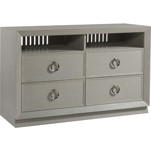 Beautifully proportioned case with architectural lines and repeated chamfered moldings, all dressed in white oak wire brushed ceruse. There are four Zeitgeist silhouettes designed to either stand alone or be grouped together in dramatic wall configurations, with the depth differential creating a breakfront effect. The media console includes four full-extension self closing drawers below two open compartments with ventilated backs and removable back panels for components. The open compartments are 24.5"W x 6.25H each. Quartered white oak veneers and solids are finished in the white and gray wire brushed ceruse finish.