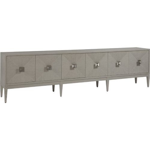 Requests for long media consoles inspired this stunning design, featuring the wire brushed ceruse finish on white oak, applied over six four-way chamfered concave door panels, with brilliant silver-clad hardware imitating the quartered oak wood grain. This piece will anchored even the 100" class of ultra-high-end monitors, and ships with two sets of legs for further versatility at 30 or 26 inch height. The three pair of doors open to three full-extension self-closing drawers, three adjustable shelves, and ventilated/removable back for media components.