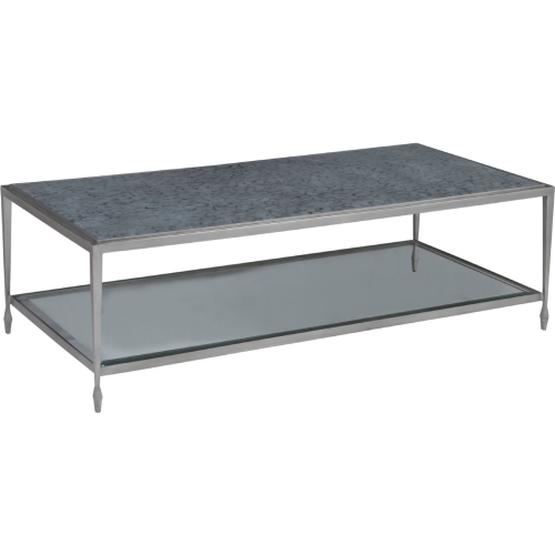 Light, airy designs in solid iron finished in antiqued silver leaf. The transitional cocktail table has a top and shelf featuring Eglomise glass painted by individual artists in a soft grey evoking pooled water.