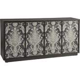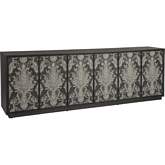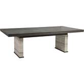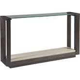 Contemporary design crafted from select hardwoods and flat-cut oak veneers in a heavily sandblasted rich mocha brown color with a satin sheen. Features an inset tempered glass top, a Fantasy travertine shelf, and a recessed plinth base.