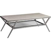 Steel base in a ribbed brown finish with a Desert travertine top and two beveled tempered glass shelves.