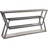 Steel base with tapered legs in a ribbed silver leaf finish with a White Vein travertine top and an inset beveled tempered glass shelf.