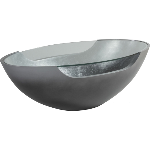 • Oval bowl-effect table with smooth a exterior in an silver gray with ombre effect, contrasted against an interior in silver leaf, with inset tempered glass top. Glass top 46.75"W x 24.75"D x .375" thick.