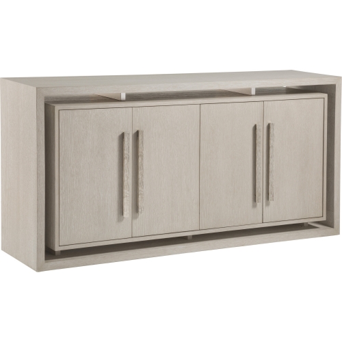 The media console incorporates negative space wherein the doors appear to float within the cases. The four doors with stainless steel accents, and nickel hardware, open to reveal four adjustable shelves. The ventilated back is designed with technology in mind.