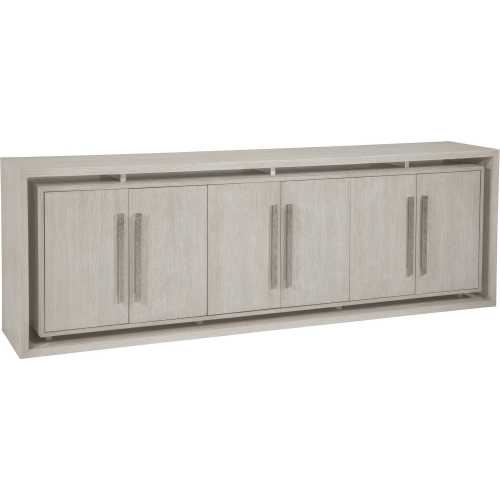 The longer media console incorporates negative space wherein the three pairs of doors appear to float within the case. The six doors with stainless steel accents, and nickel hardware, open to reveal six adjustable shelves. The ventilated back is designed with technology in mind.