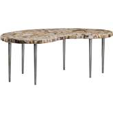 Live edge contemporary design boasting a 50" asymmetrical top inlaid with fossilized shell standing on an iron base constructed of tapered legs and cantilevered supports in a silver finish with a hint of gold. While solid petrified wood items vary greatly from piece to piece, we have selected a color range for the veneered tops on the Caldera pieces that will result in beautiful earth tones. Petrified wood color will vary from top to top.
