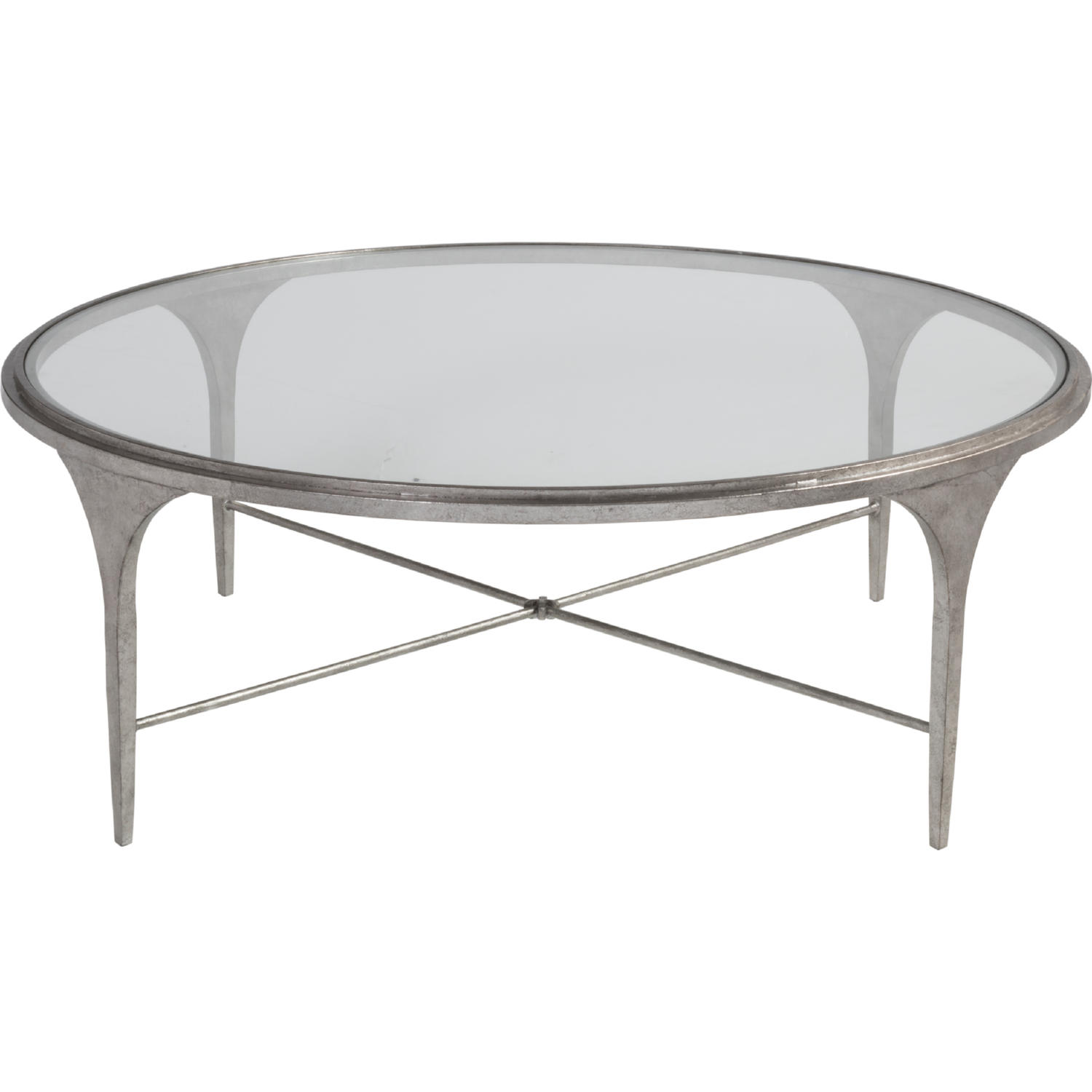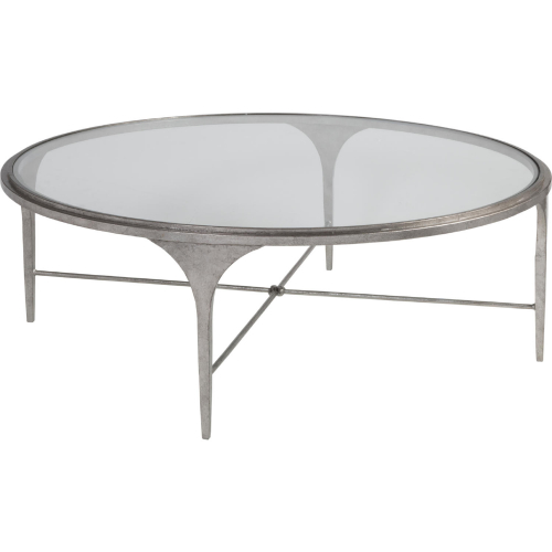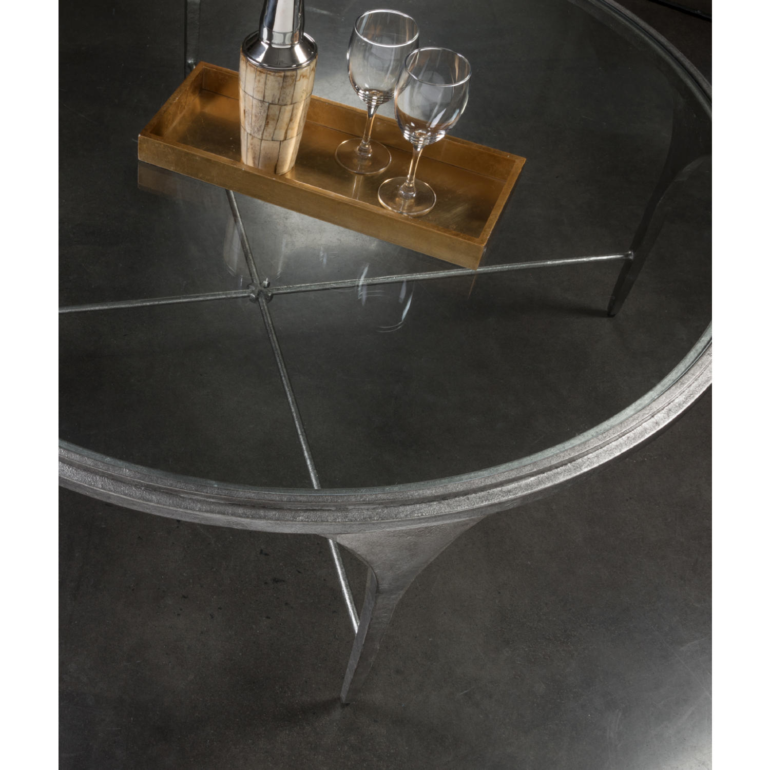 Artistica Home Porto Round Cocktail Table in Hammered Textured Silver Iron & Glass