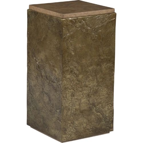 Accent table in the form of a square column, with organic asymmetrical nature form castings of Brazilian slate clad in bronze on all four sides and topped with walnut burl veneer.