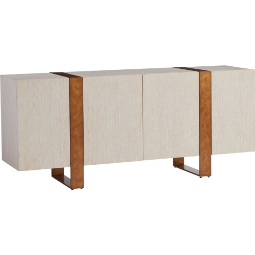 The 75-inch Bixby buffet is a signature item in the collection. The contemporary Calais brass finished metal base design encircles the piece, dividing the door configuration in the front. Behind the four doors are six adjustable wooden shelves for storage.