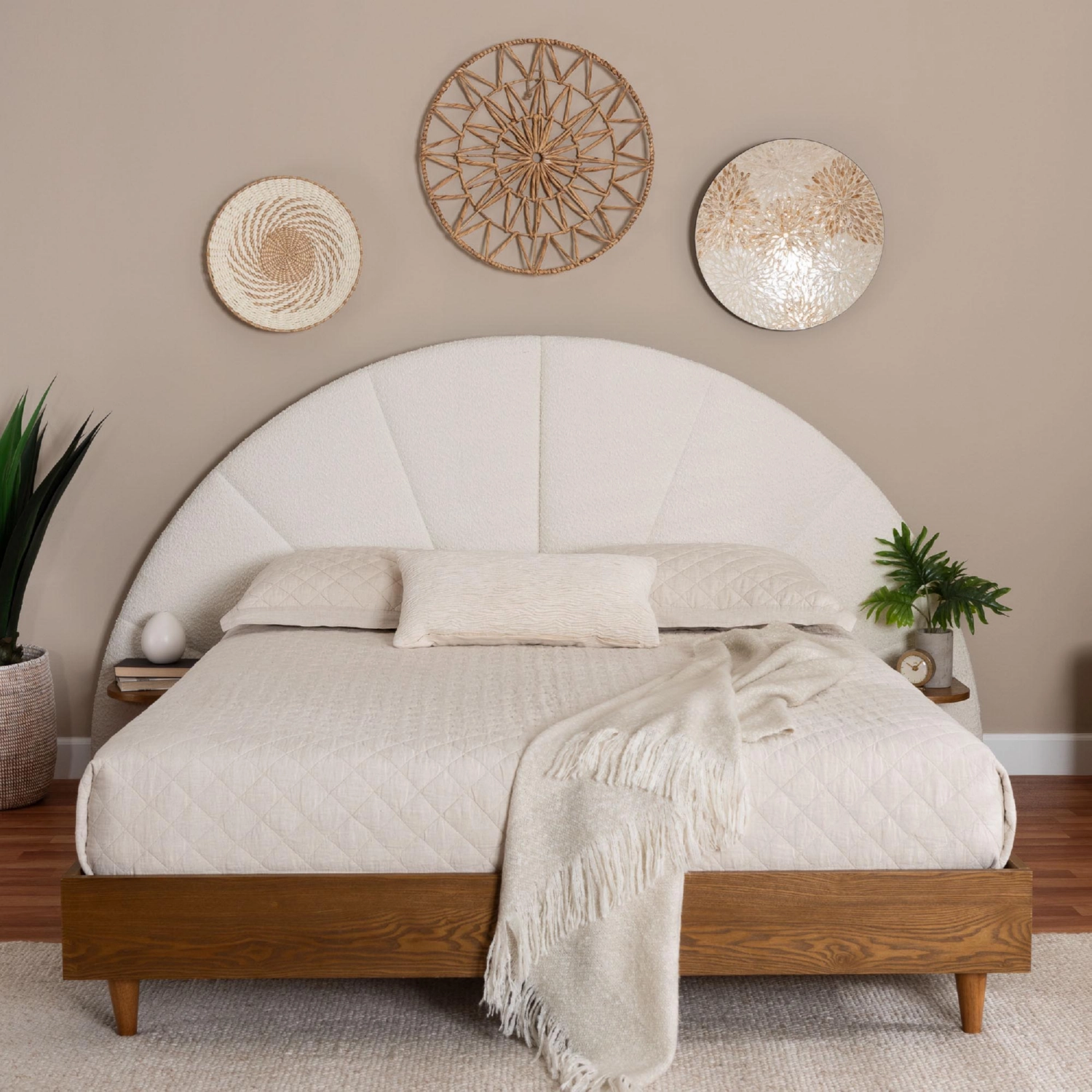 Baxton Studio Bernice Queen Bed in Channel Tufted Cream Boucle & Walnut Brown Wood