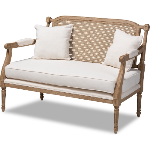 Baxton Studio Clemence Loveseat in Ivory Fabric, Rattan & White Wash Wood