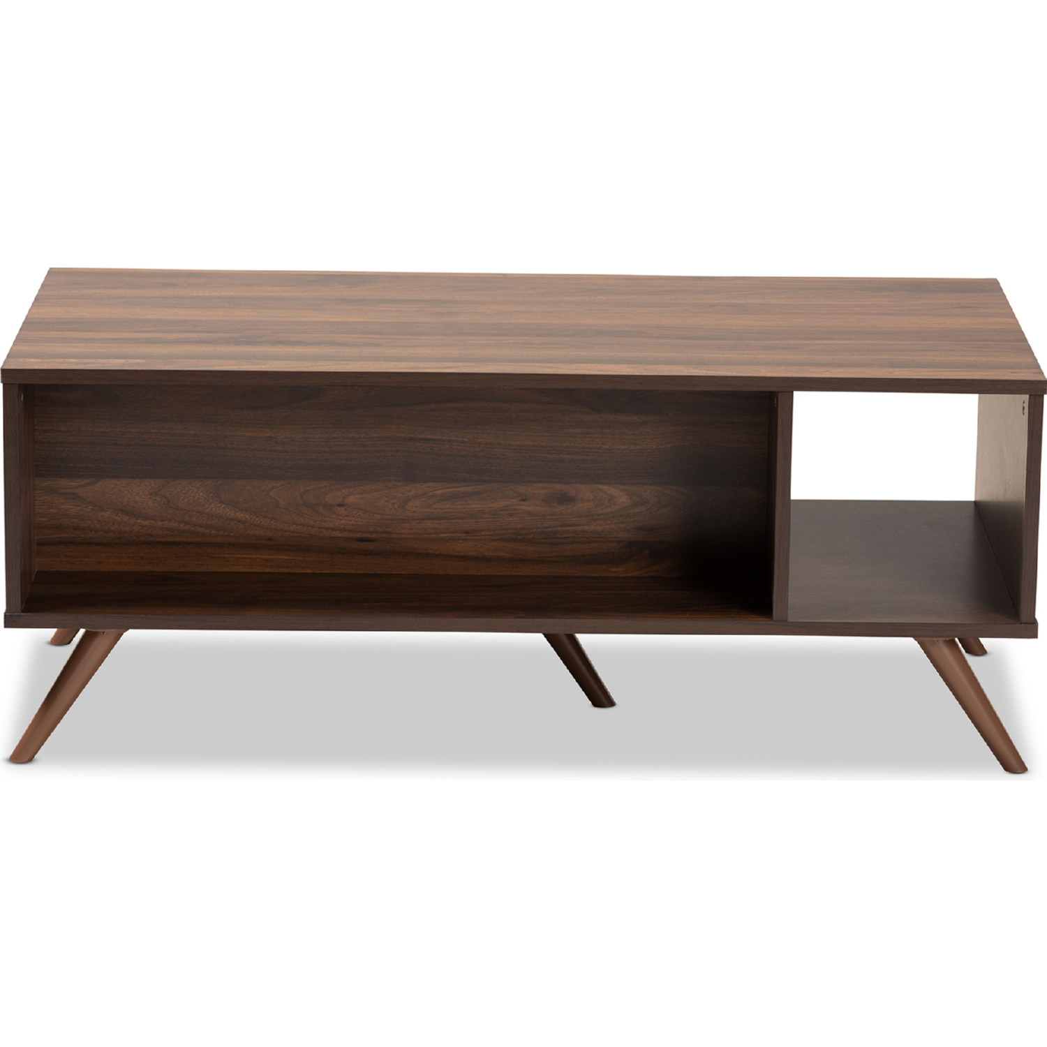 With an ultramodern, finish and ample storage space, the Naoki coffee table is sure to make an impression in any space. This wood coffee table features one drawer to store remotes, cords, and more. Two shelves provide space to display books and magazines, while the spacious table top is well suited for a potted plant and a cup of coffee. A gray and walnut finish are paired with long, vertical brown handles for a cool, contemporary look. Requiring assembly, the Naoki coffee table is supported by splayed legs that create a chic, retro profile.