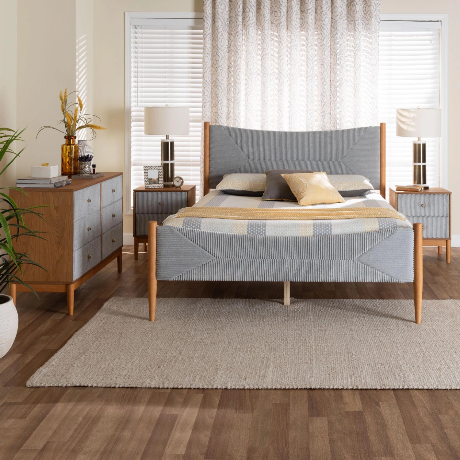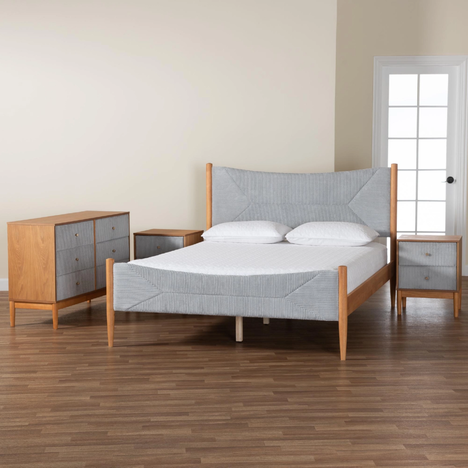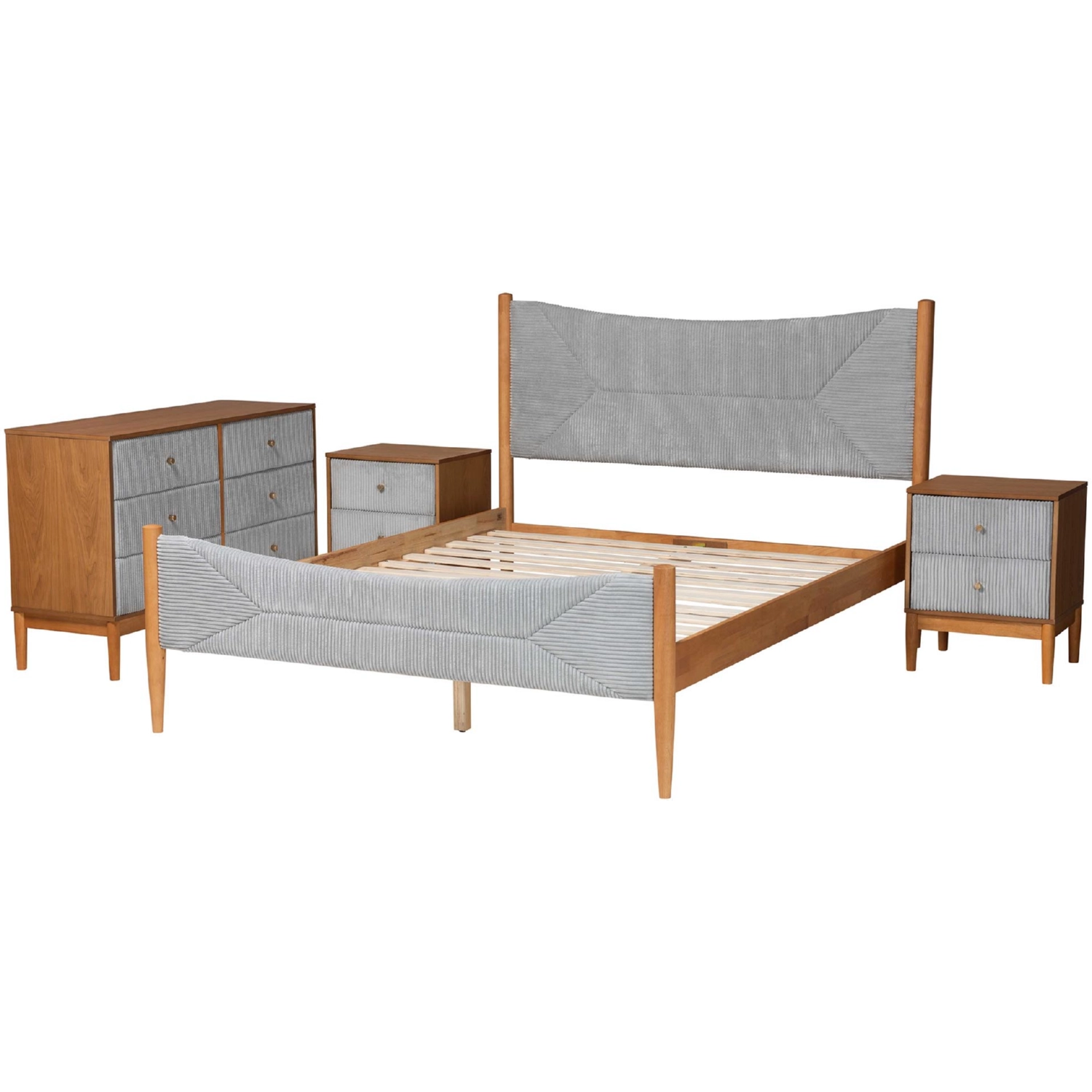 Baxton Studio Taylin 4 Piece Queen Bedroom Set in Grey Corduroy Fabric & Oak Finish Wood