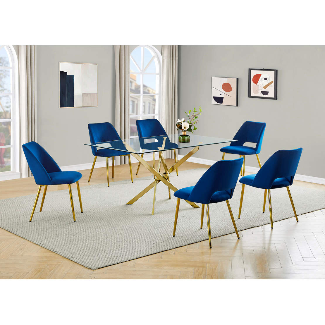 Best Quality 7 Piece Dining Set in Tempered Glass, Gold Chrome & Navy Blue Velvet
