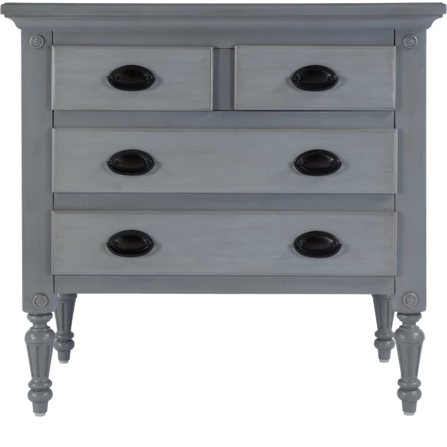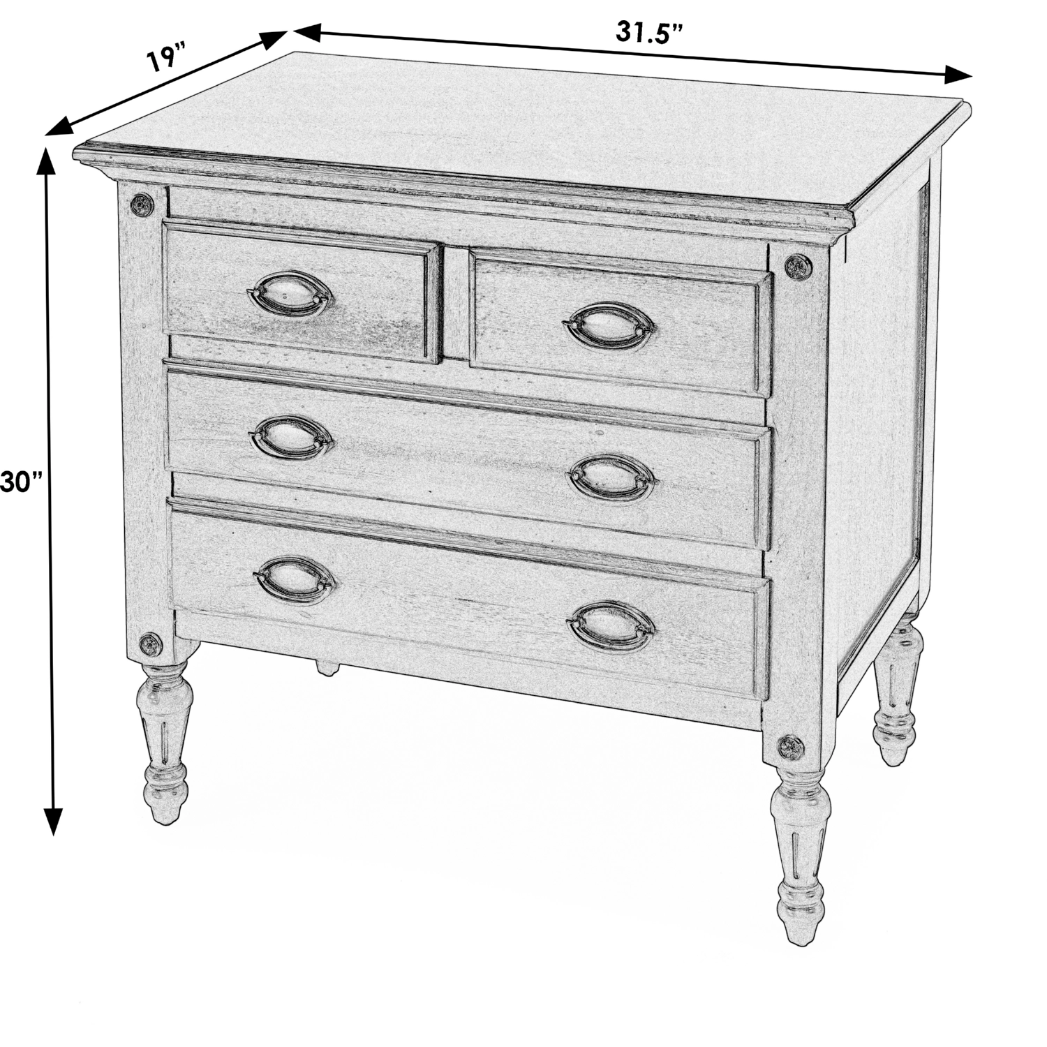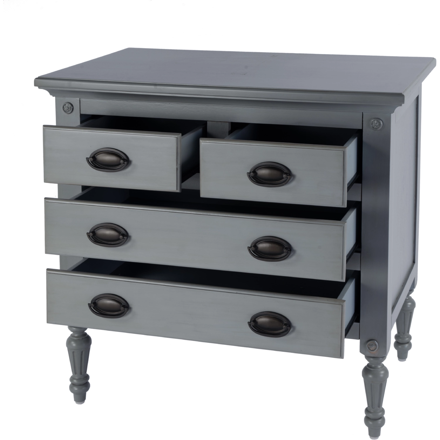 • Four spacious drawers glide smoothly on metal slides and are accented with bronze antique oval pull hardware