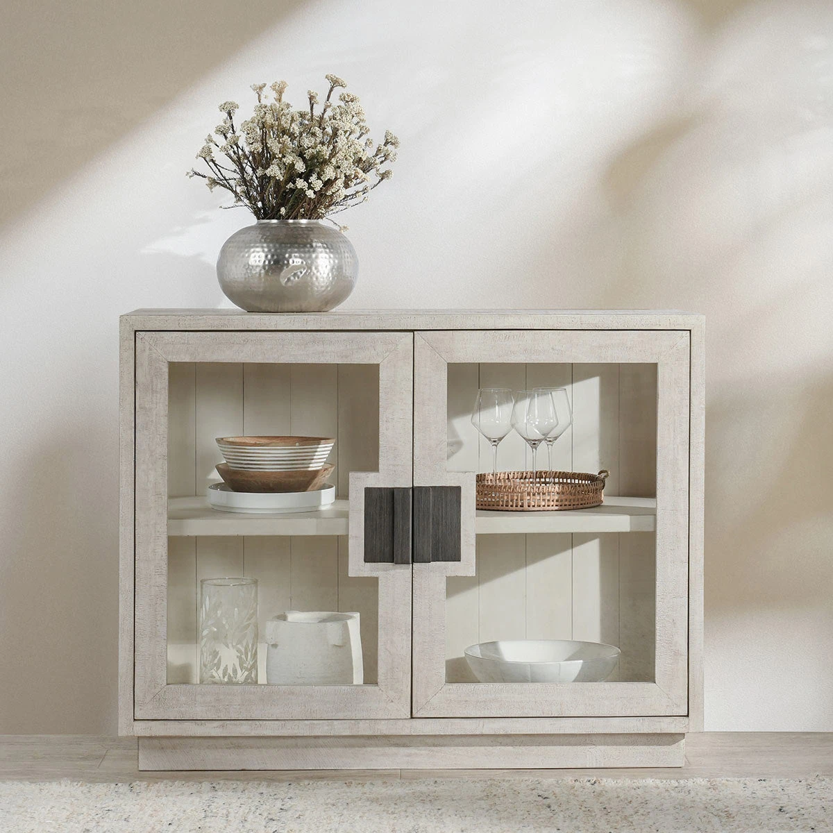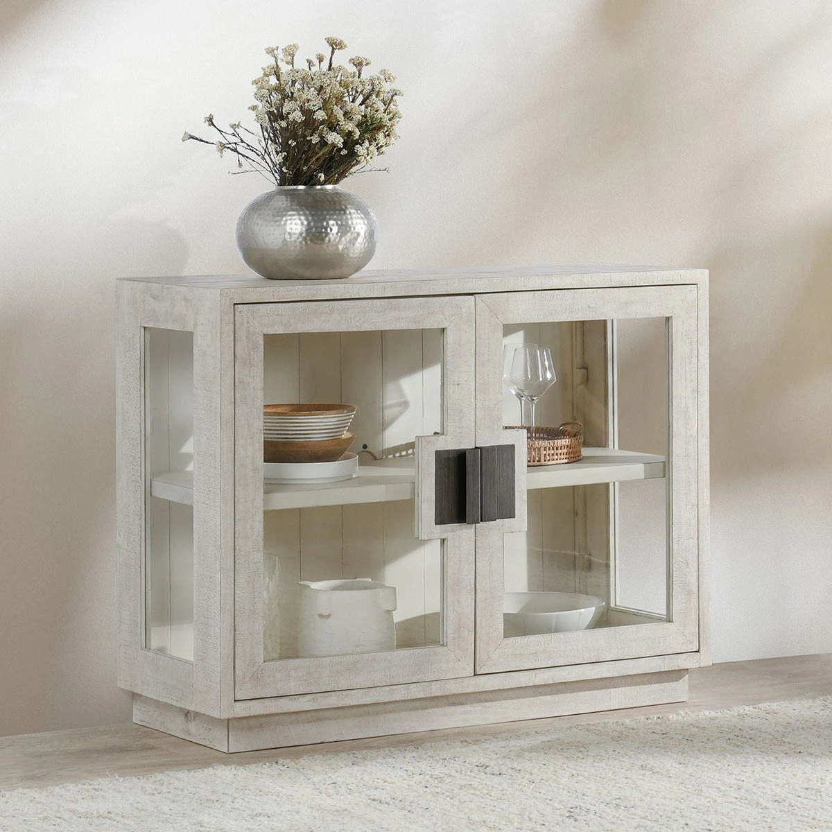 Larson 2 Door Cabinet in White Washed Reclaimed Pine & Tempered Glass
