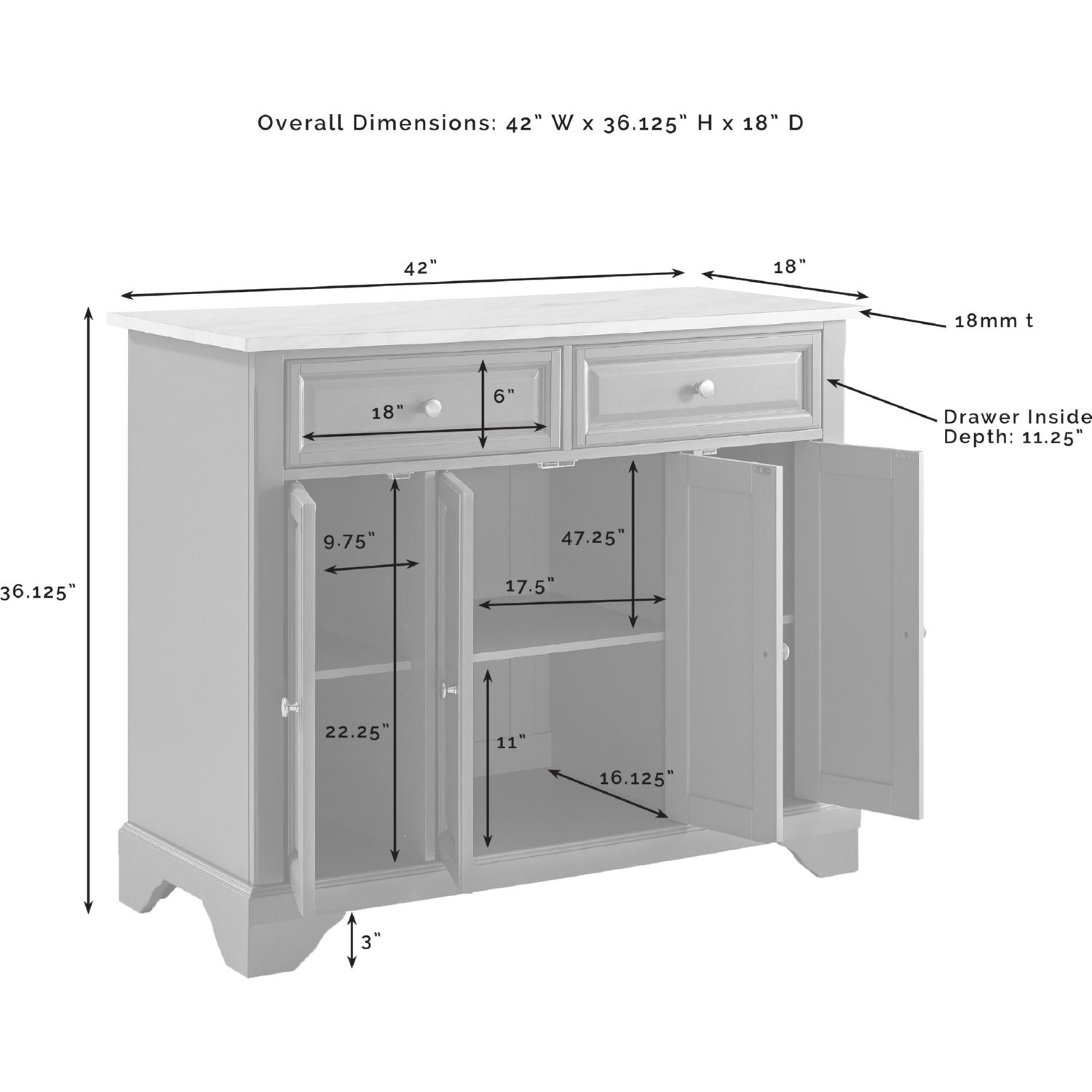 Dimensions: 42.13"W x 18"D x 36"H, Island height with feet 36.13", Cart height with casters 36.63"