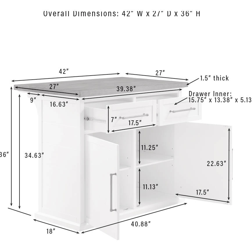 Dimensions: Kitchen Island: 42"W x 27"D x 36"H, Stool: 14.75"W x 14.75"D x 24.25"H, Floor Clearance: 5.63", Seat: 14.75"D x 24.25"H