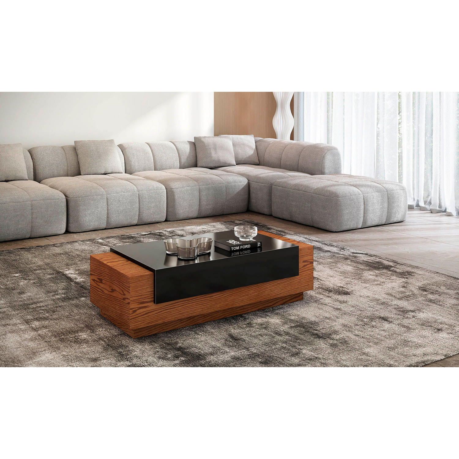 Contemporary Coffee Table featuring an American White Oak Case finished with a warm honey surface complemented by a high gloss black lacquer element. A perfect match for Media TV Consoles FT75FA & FT57FA.