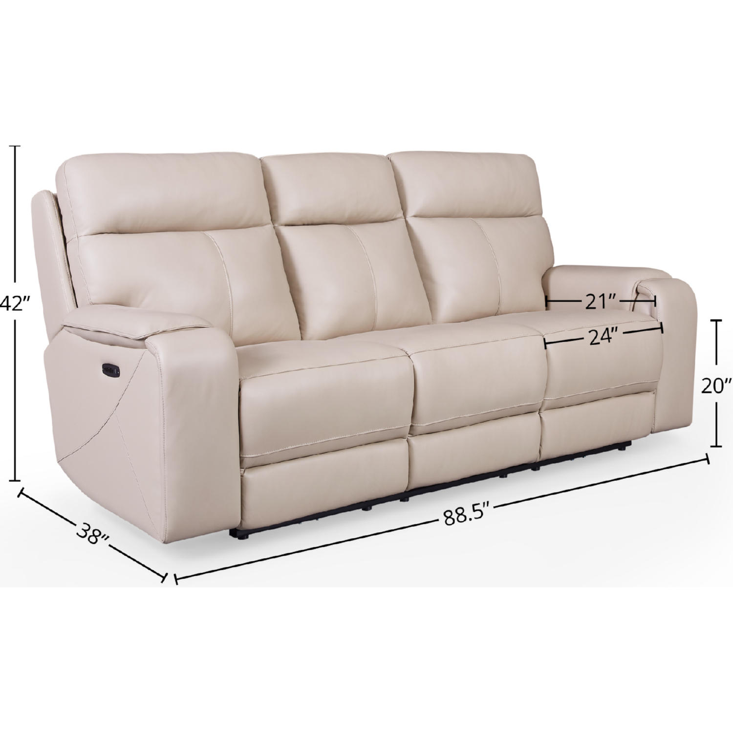 Dimensions: 88.5"W x 38"D x 42"H, Seat Depth: 21", Seat Height: 20", Arm Height: 25"