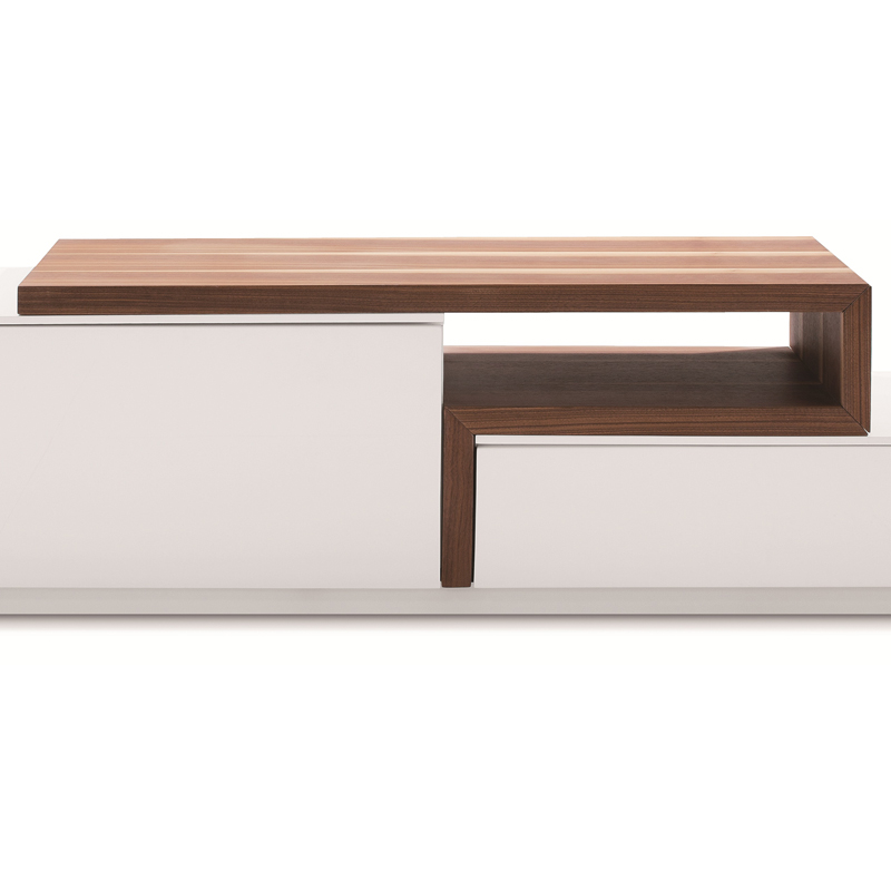 The newest addition to our modern TV bases. Quality crafted with soft closing tracks, and durable wood veneers. Available in a white lacquer & walnut finish.