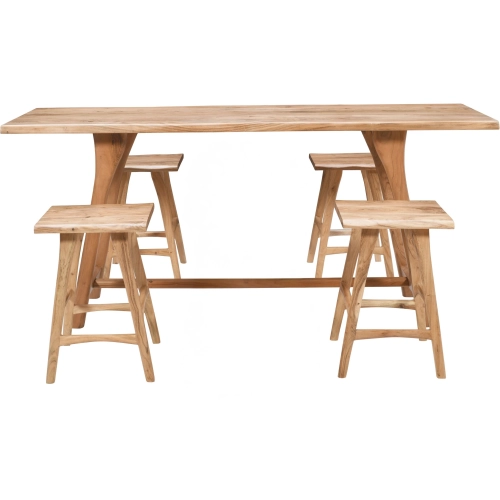 • Set includes: one 79" solid wood counter table and four matching backless stools