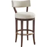 The Boswell dining arm chair features a random walnut burl veneer pattern on the outside back, with an upholstered inside back and seat. The chair is upholstered in Biscayne Alabaster fabric (Swatch#: 2304-11).