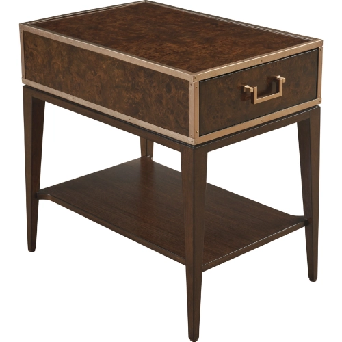 The Shelton chairside table is the ideal piece for any living area. The drawer box features random walnut burl veneer on the top and sides, a soft closing drawer, and decorative metal trim around the edges finished in rose gold over silver leaf. The base features tapered legs and a stationary wooden shelf. The piece also has a finished back so it can be floated.
